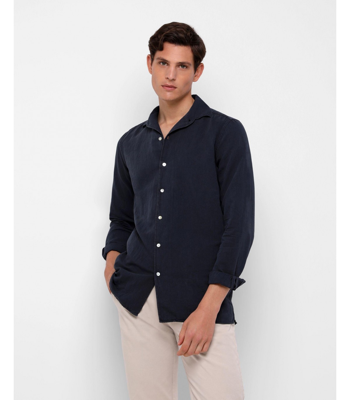 - Camisa confeccionada en tejido 100% lino. Corte Regular Fit, cuello pijamero y cierre con botones. Manga larga terminada en puño con botones.