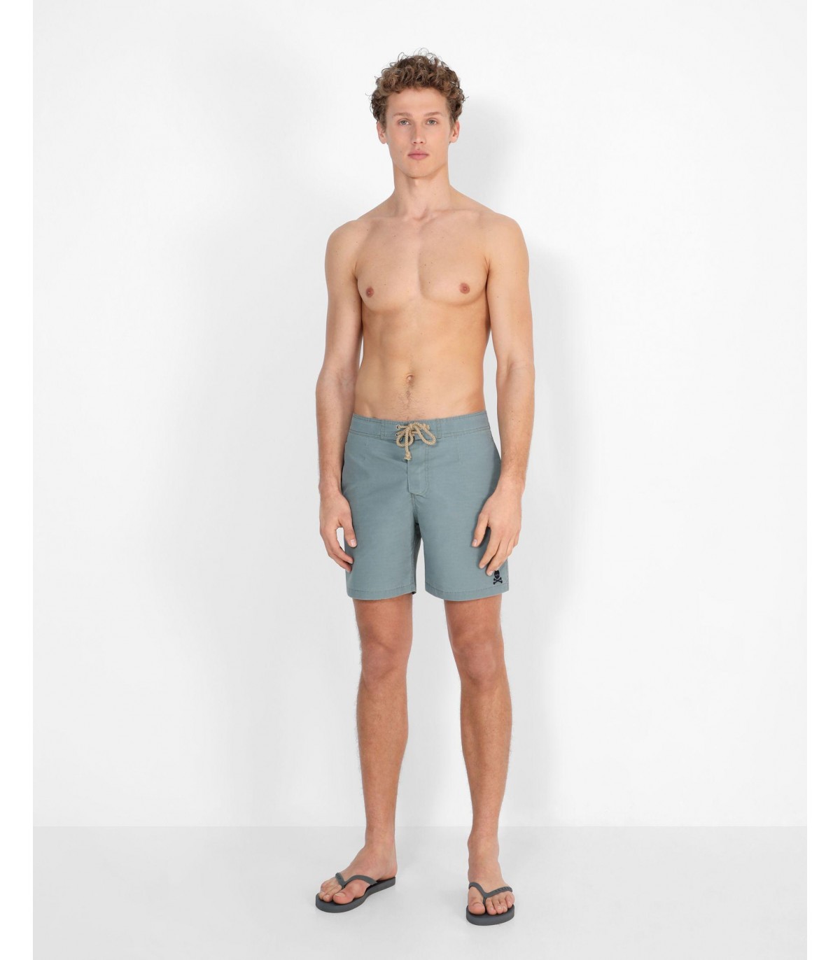 Bañador efecto lavado confeccionada en tejido de poliéster. Corte Regular Fit, cierre con cordón y velcro. Detalle de calavera bordada en el bajo.