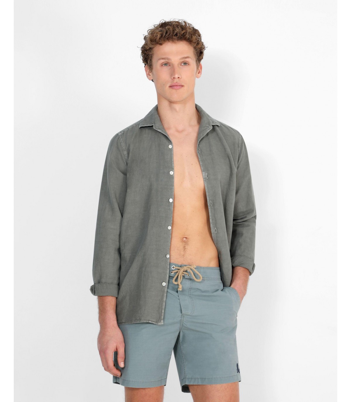 Camisa confeccionada en tejido 100% lino. Corte Regular Fit, cuello pijamero y cierre con botones. Manga larga terminada en puño con botones.