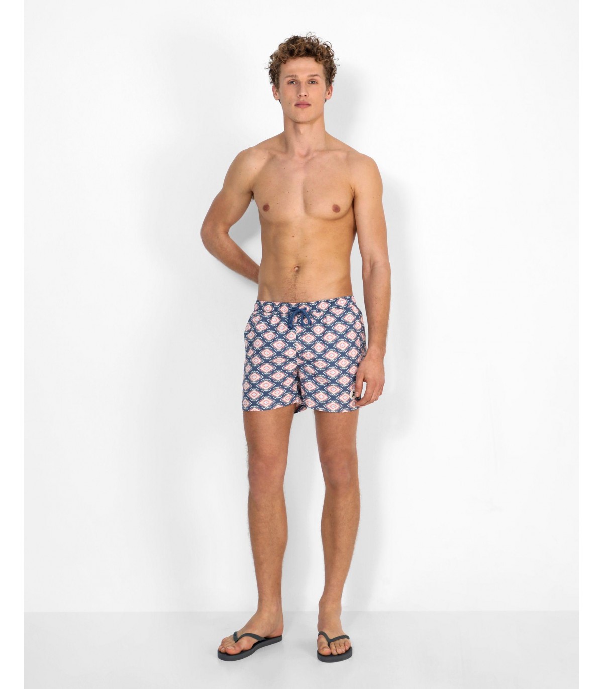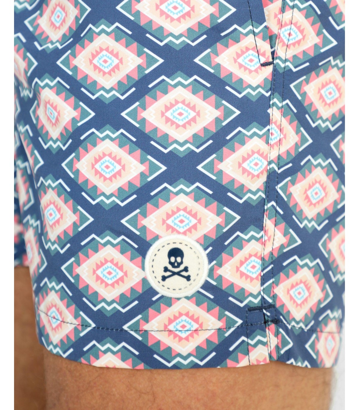 Bañador con estampado de ikat confeccionado en tejido de poliéster. Corte Regular Fit, cierre con cordón y velcro y detalle de calavera engomada en el bajo.