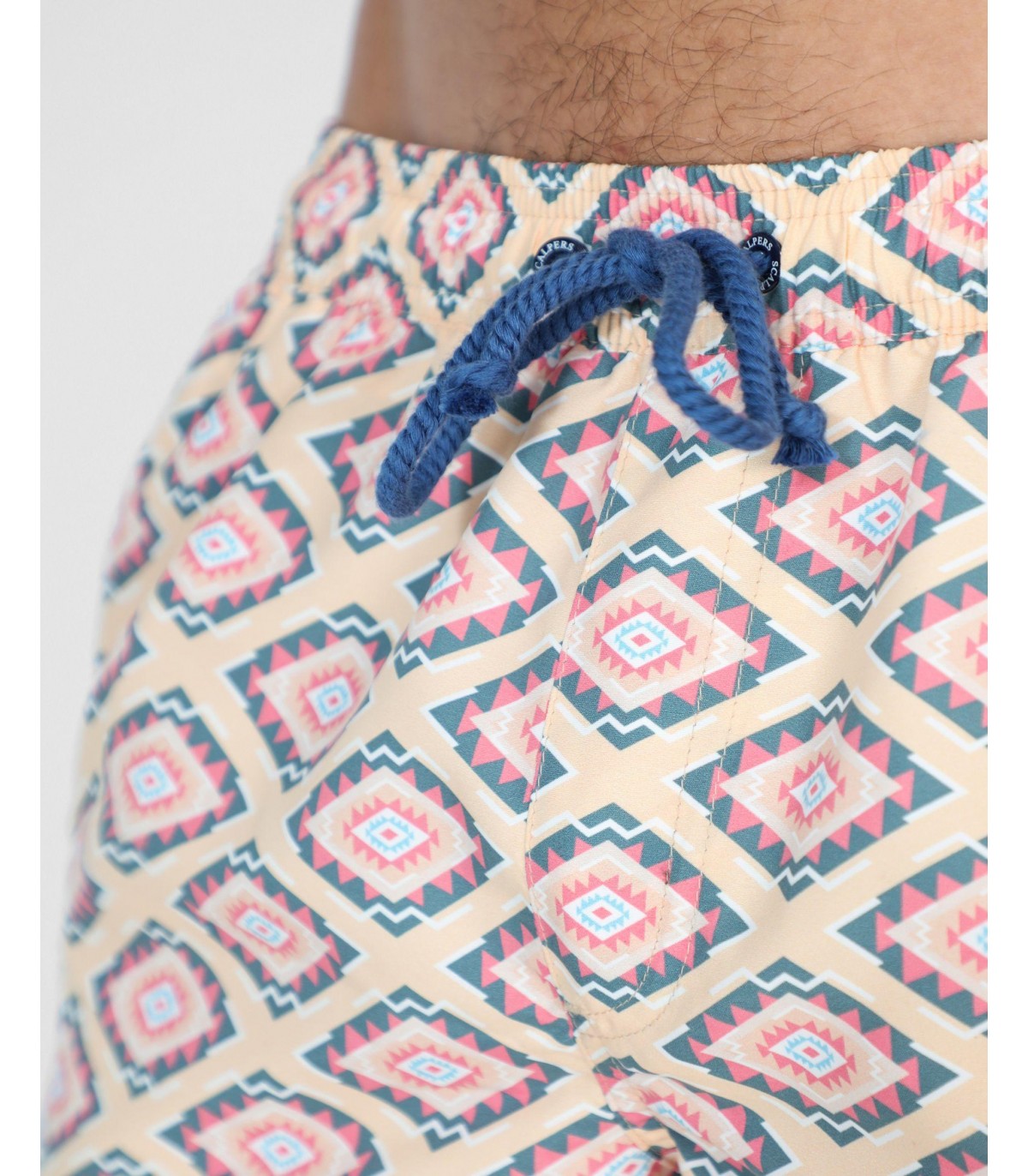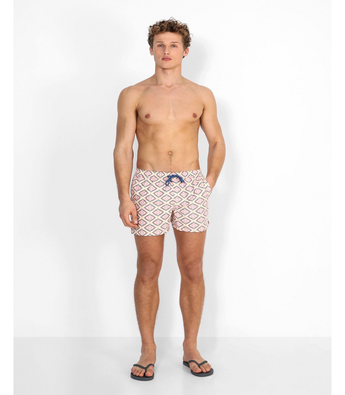 Bañador con estampado de ikat confeccionado en tejido de poliéster. Corte Regular Fit, cierre con cordón y velcro y detalle de calavera engomada en el bajo.