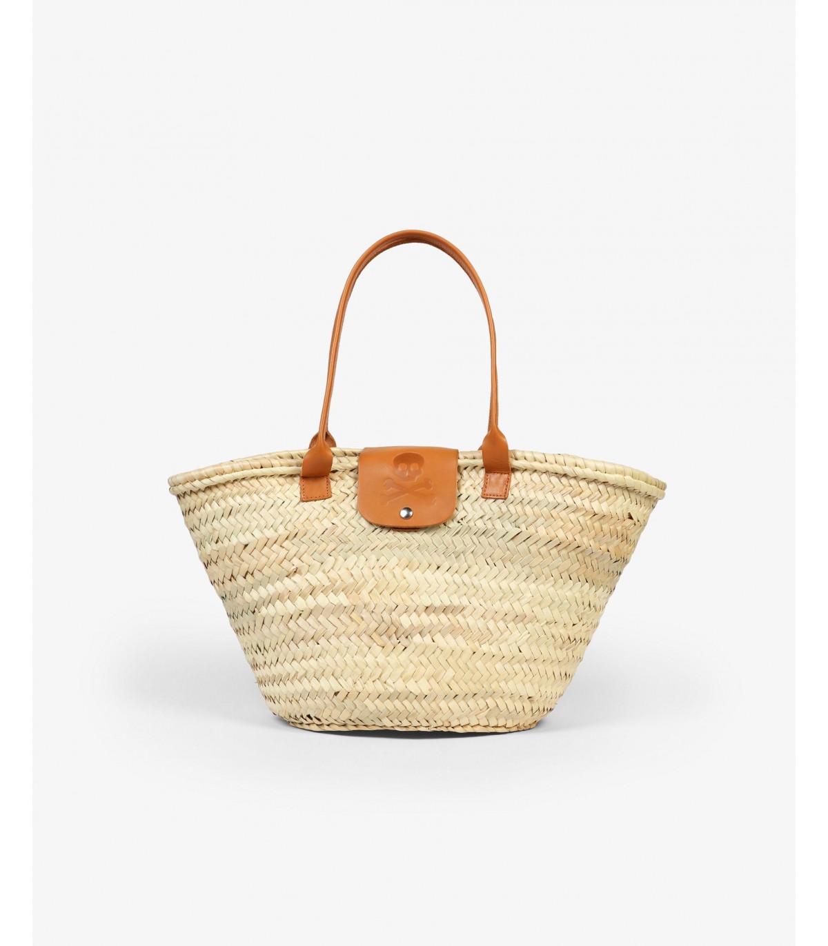 Capazo confeccionado en hoja de palma. Asas de piel y cierre con botón de snap sobre piel con calavera grabada. Detalle de bolsillo interior de piel.