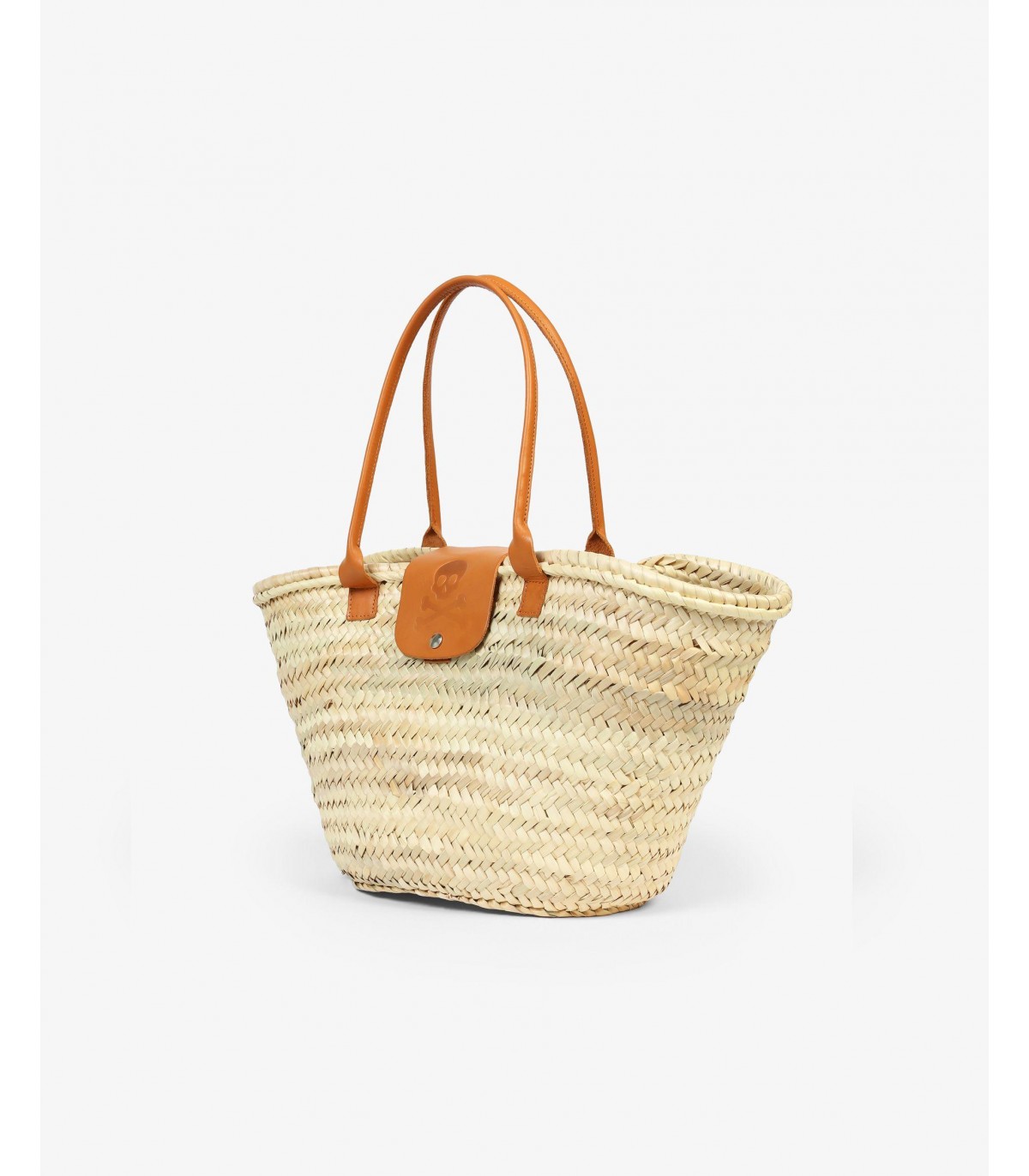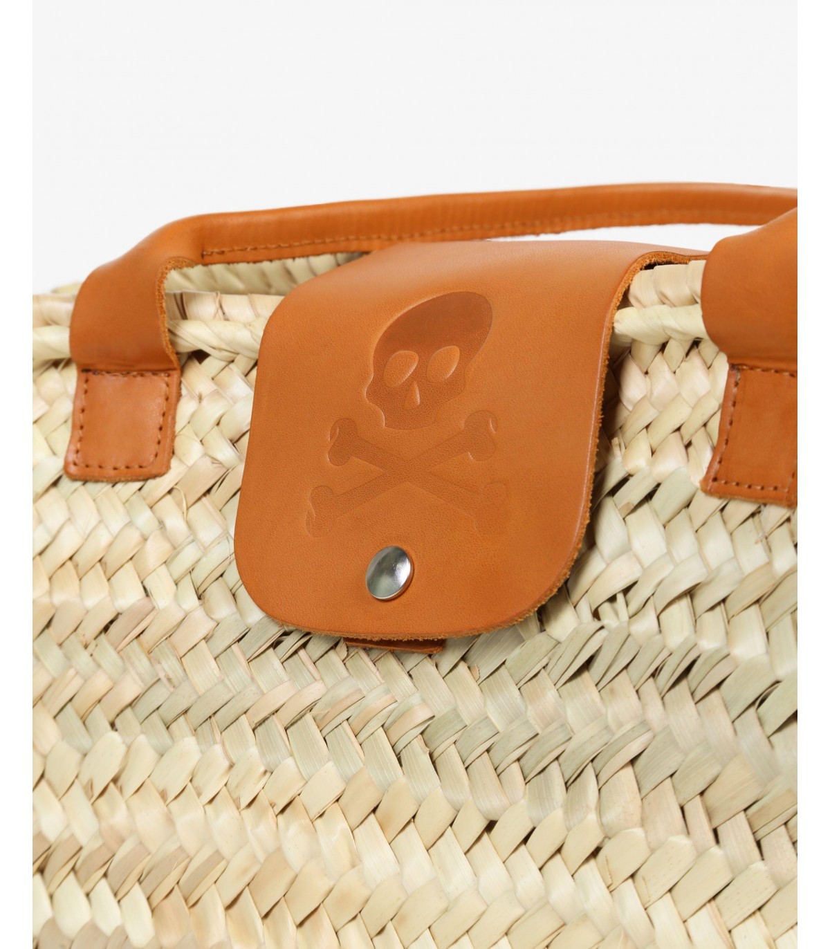 - Capazo confeccionado en hoja de palma. Asas de piel y cierre con botón de snap sobre piel con calavera grabada. Detalle de bolsillo interior de piel.