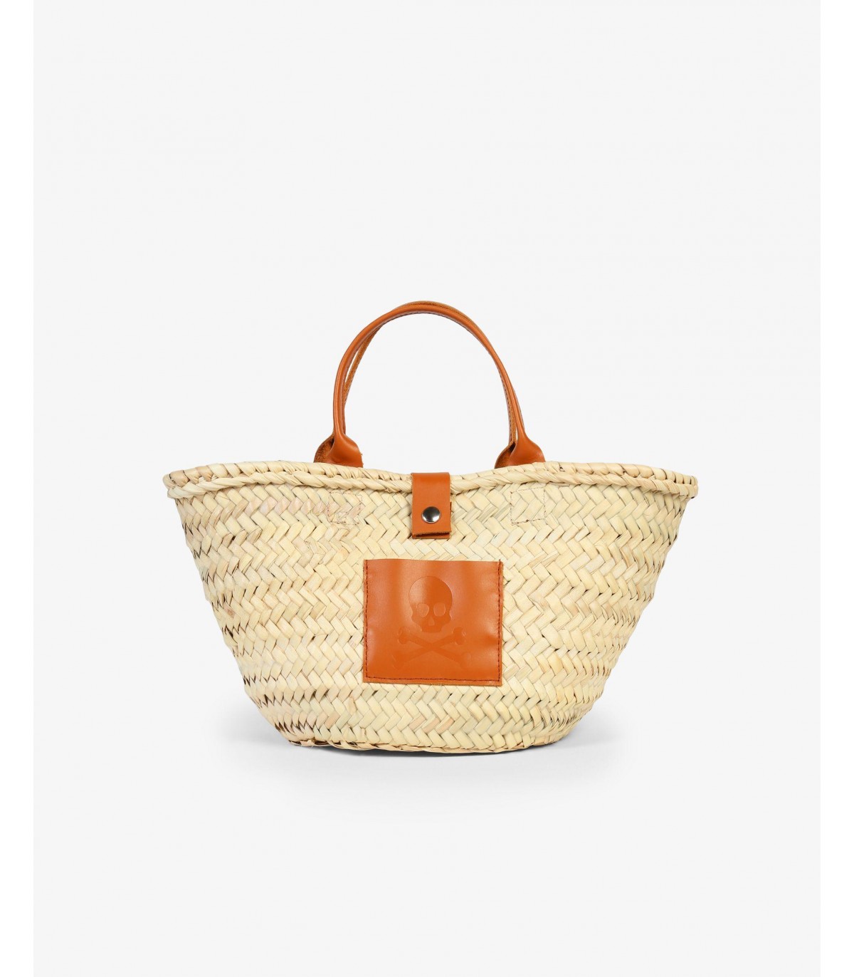 - Capazo mini confeccionado en hoja de palma. Asas de piel y cierre con botón de snap sobre piel con calavera grabada. Detalle de bolsillo interior de piel.