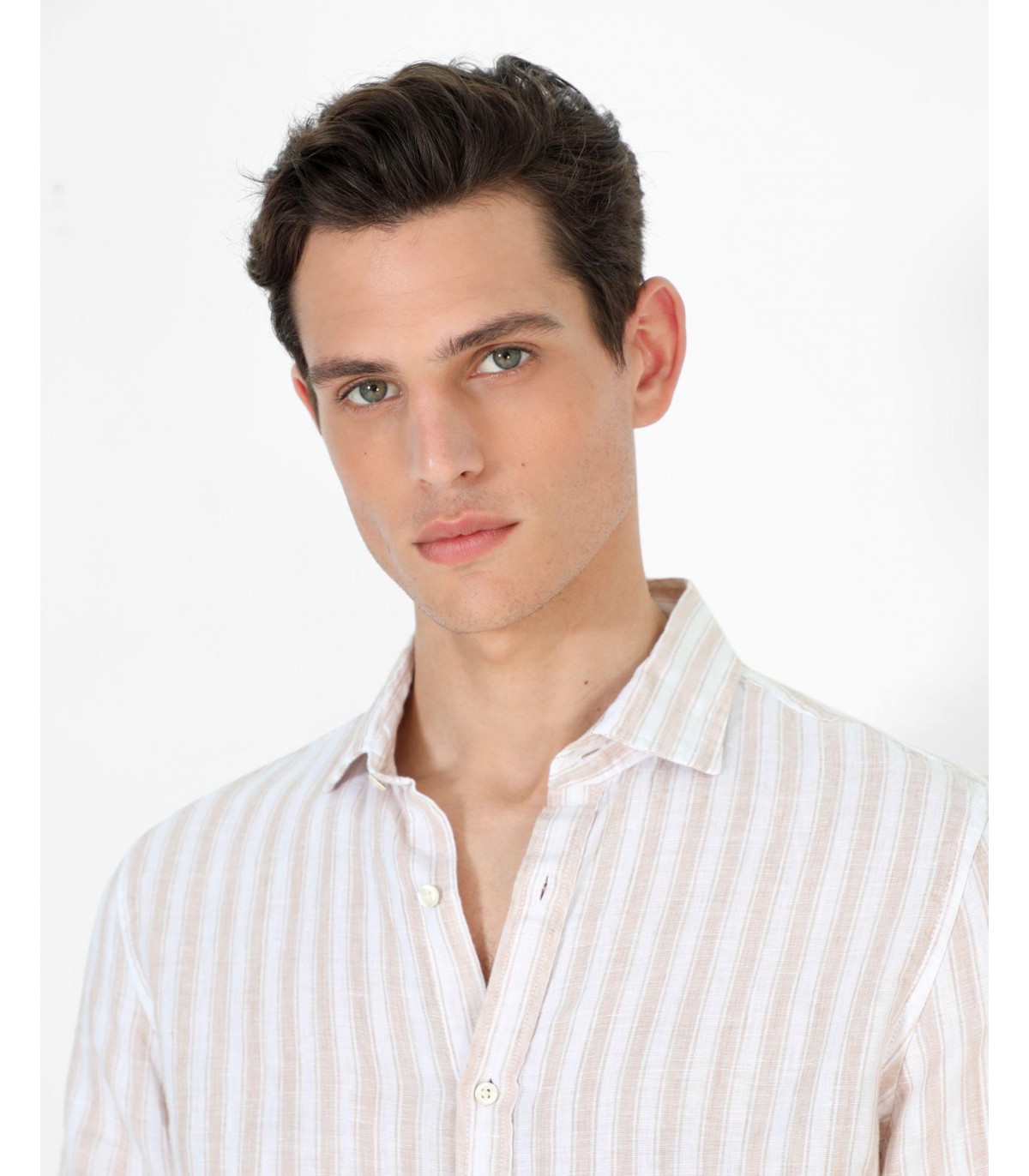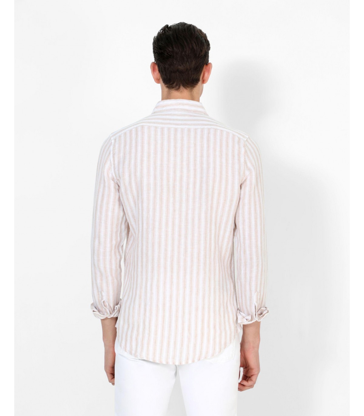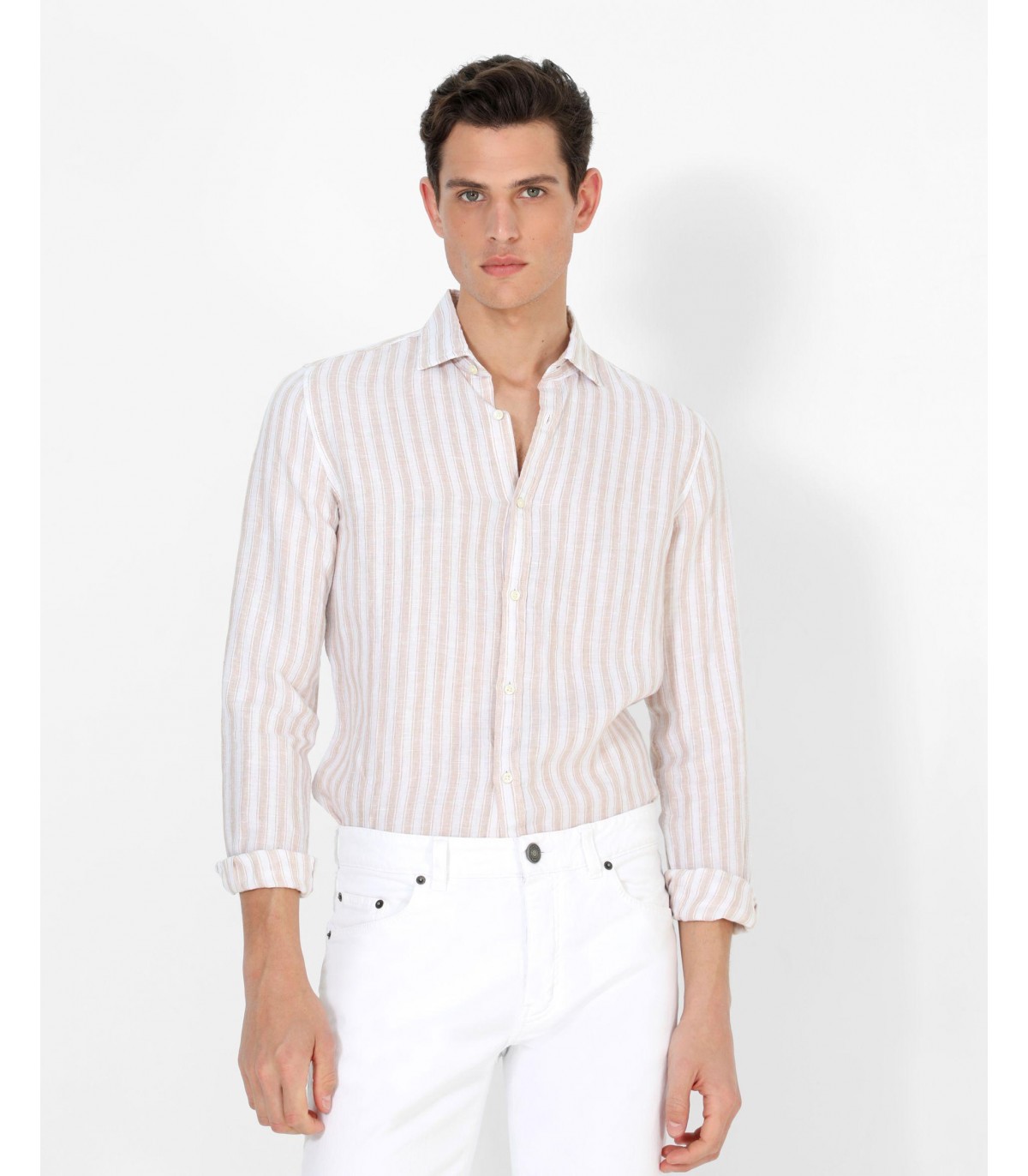 Camisa de rayas confeccionada en tejido 100% lino. Corte Slim Fit, cuello italiano y cierre con botones. Manga larga terminada en puño con botones.