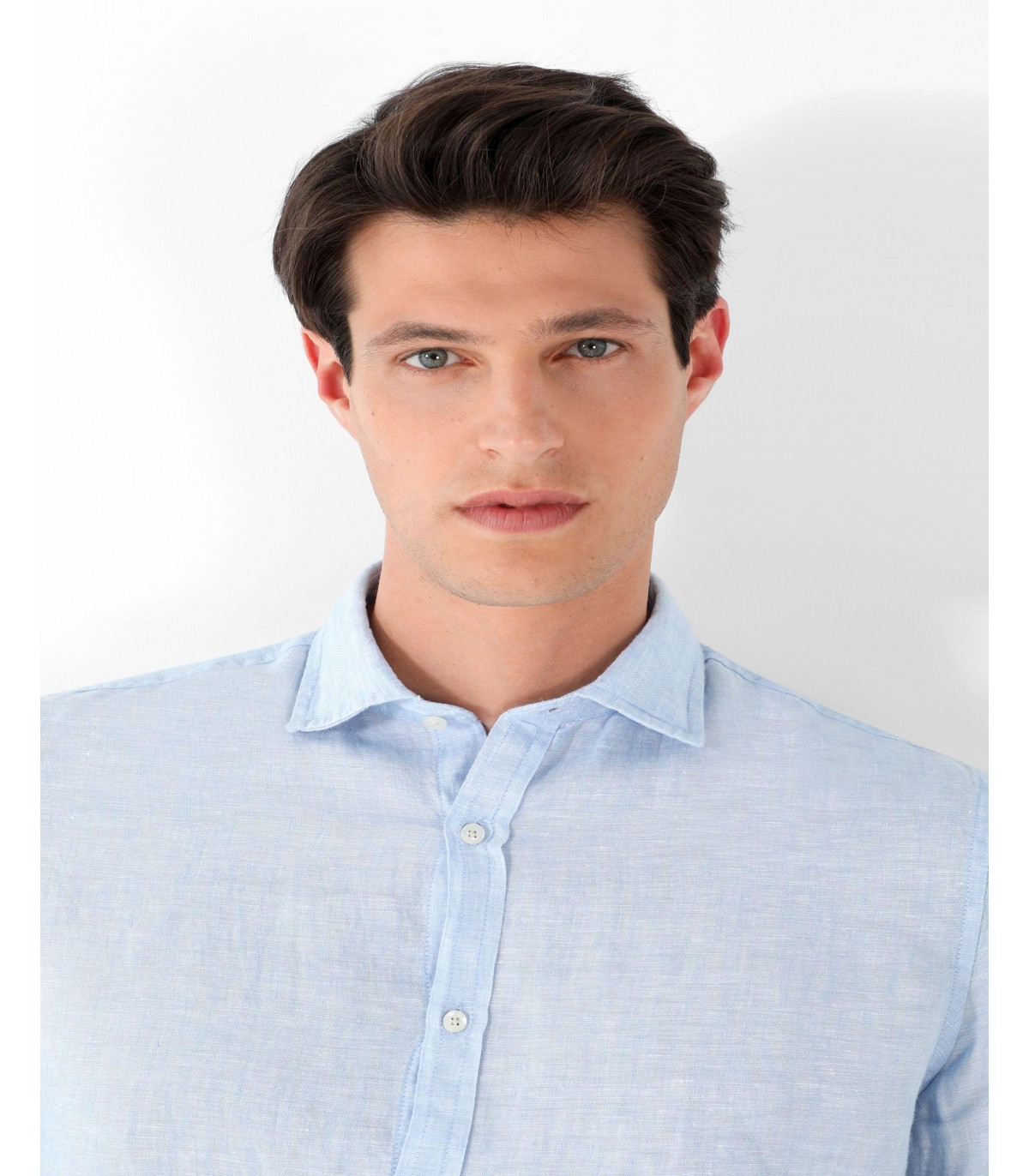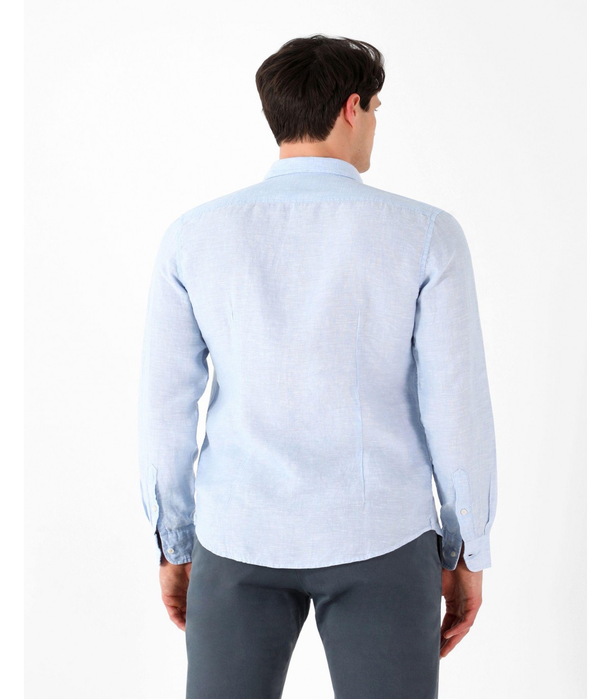 Camisa confeccionada en tejido 100% lino. Corte Slim Fit, cuello italiano y cierre con botones. Manga larga terminada en puño con botones.