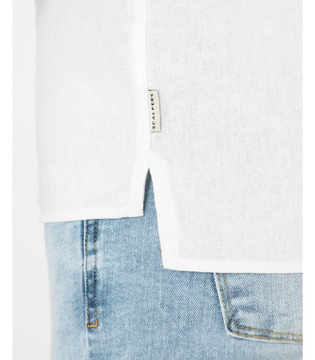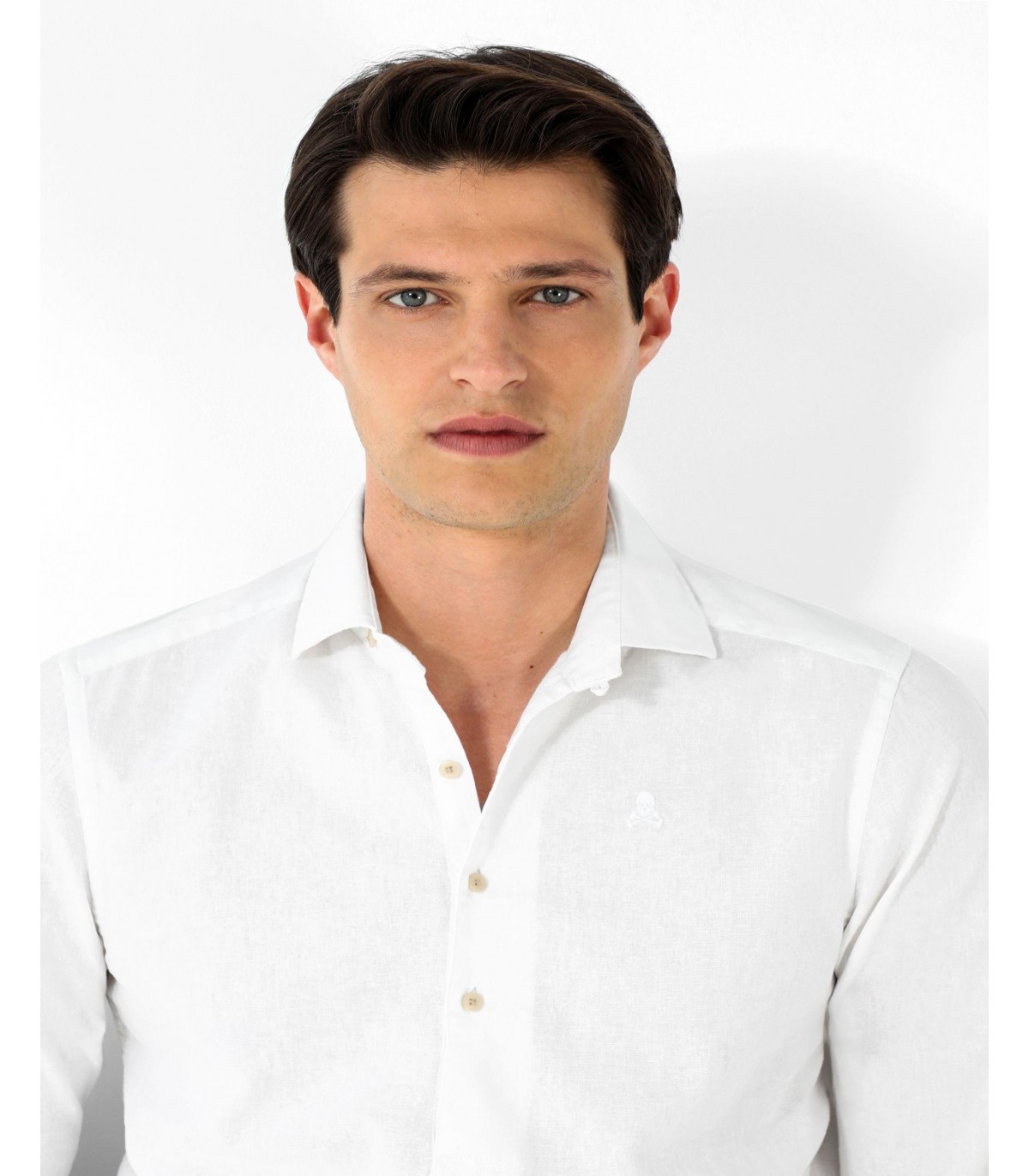 Camisa confeccionada en tejido 100% lino. Corte Regular Fit, cuello pijamero y cierre con botones. Manga larga terminada en puño con botones.