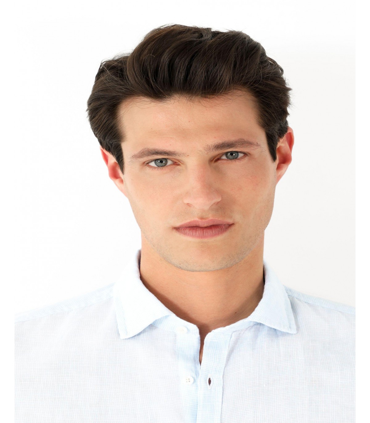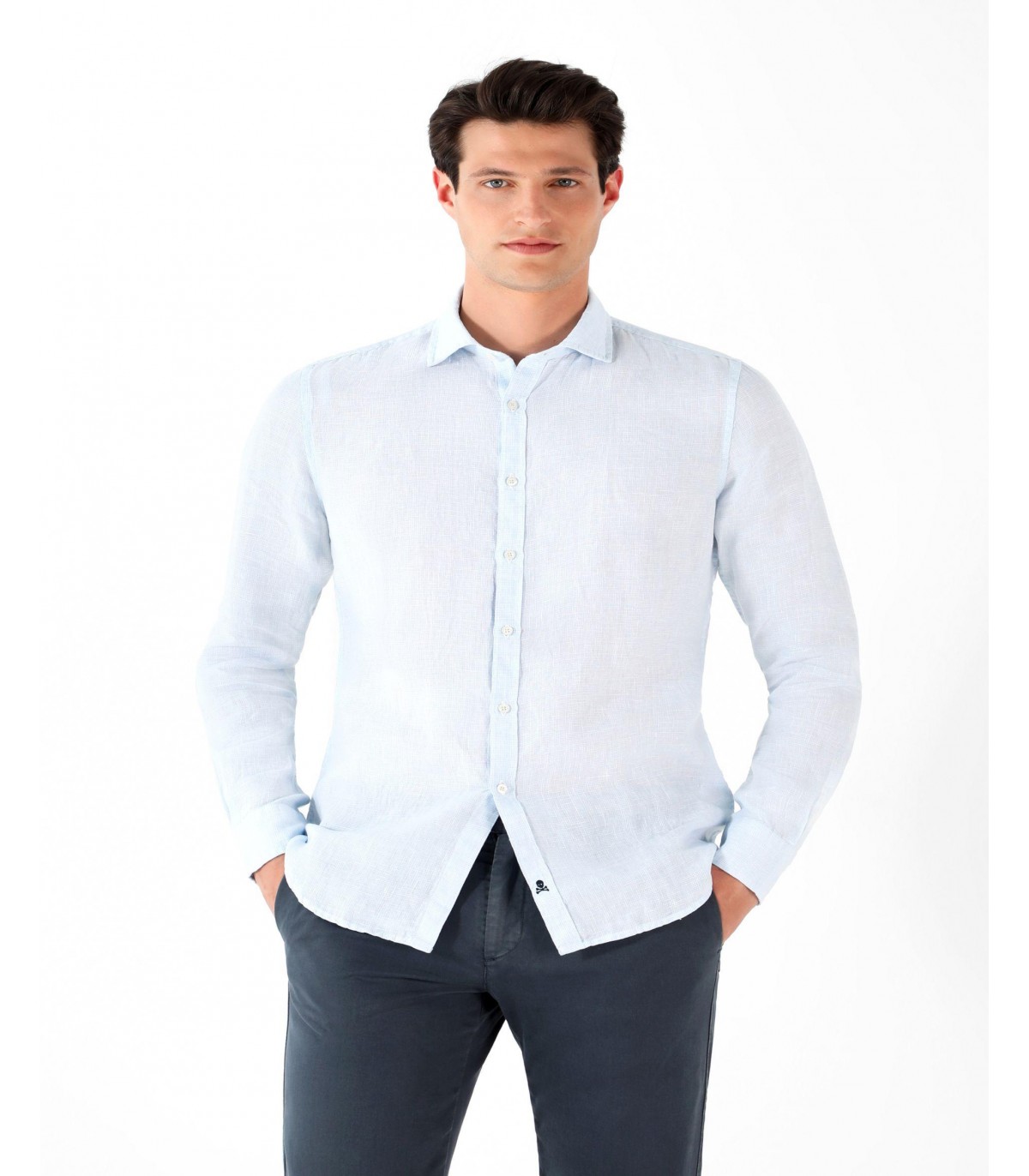 - Camisa de cuadros confeccionada en tejido 100% lino. Corte Slim Fit, cuello italiano y cierre con botones. Manga larga terminada en puño con botones.