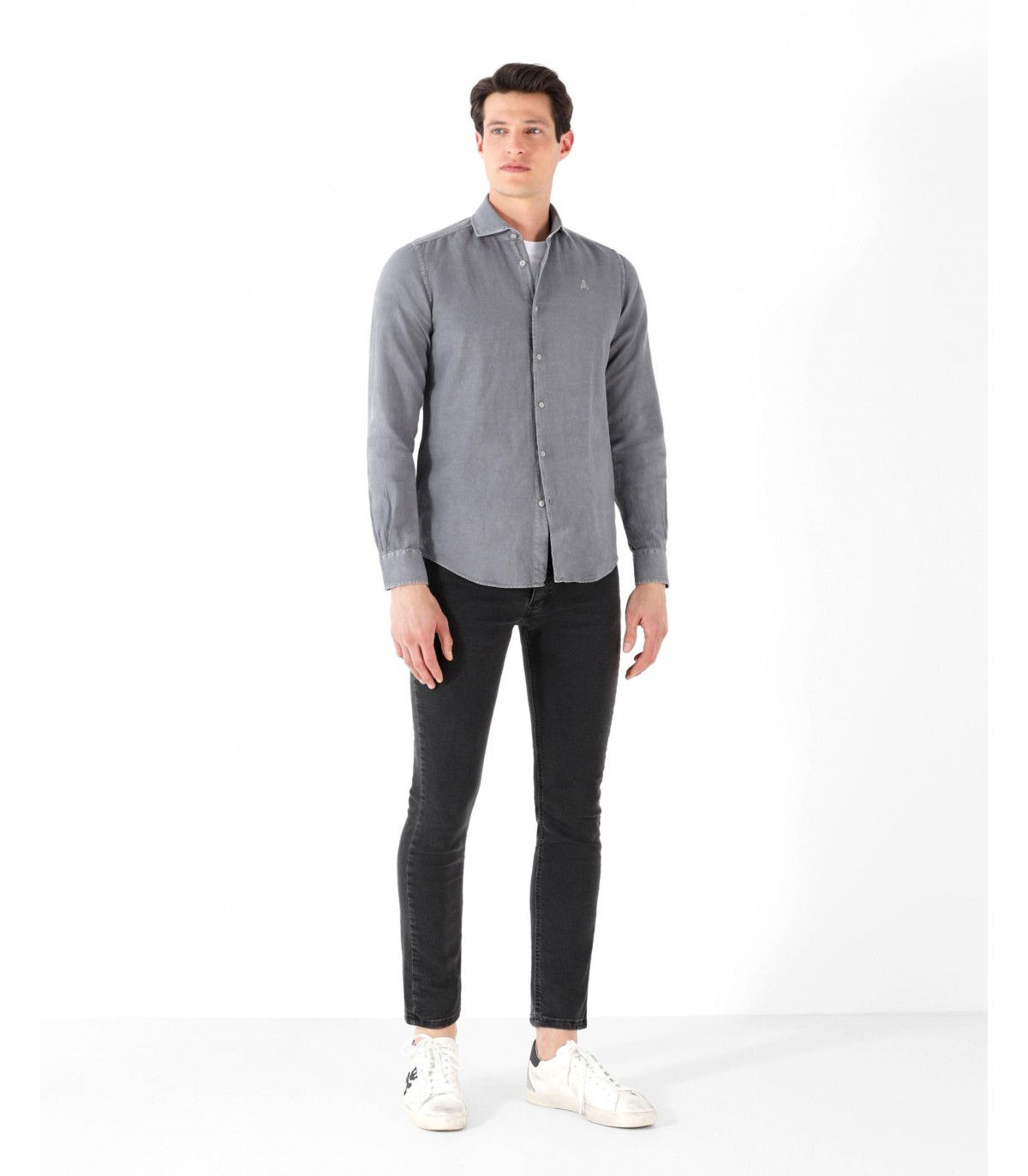 Camisa confeccionada en tejido 100% lino lavado. Corte Regular Fit, cuello cutaway y cierre con botones. Manga larga terminada en puño con botones y detalle de calavera a tono.