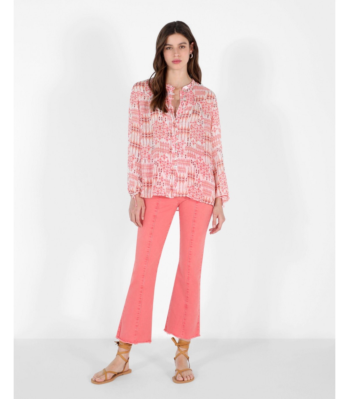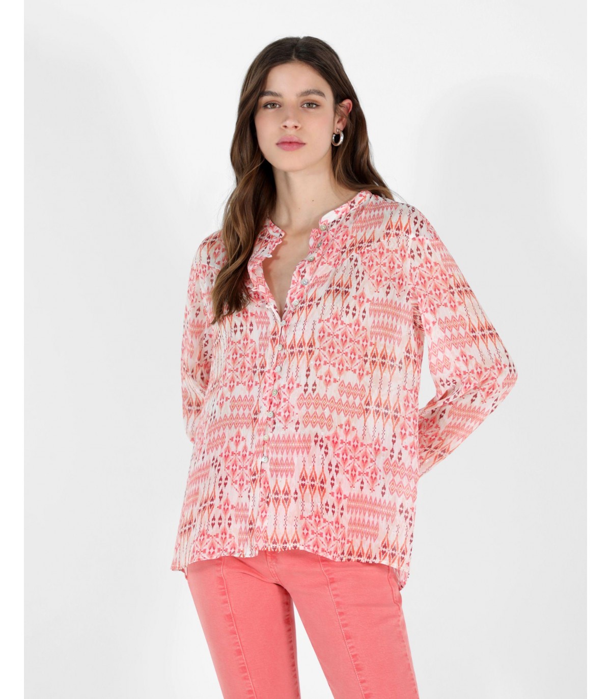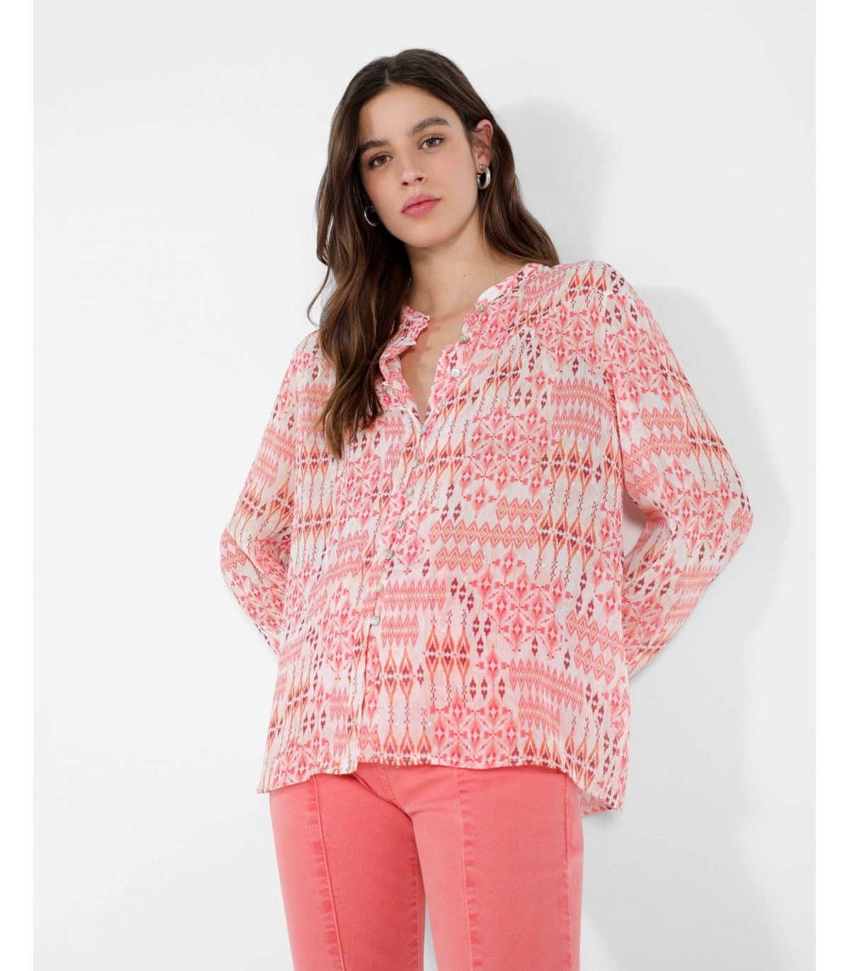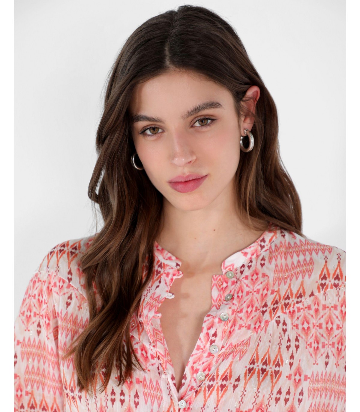 Blusa estampado confeccionada en tejido con detalle metalizado. Corte Regular Fit, cuello redondo y cierre con botones. Manga larga terminada en puño con frunce.
