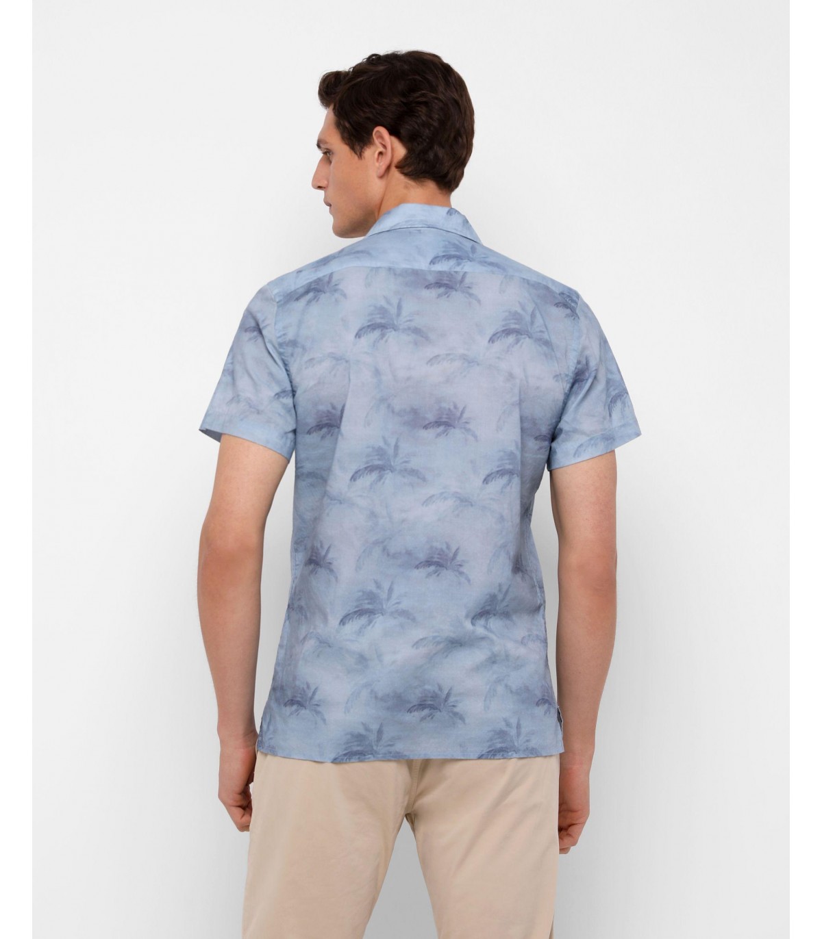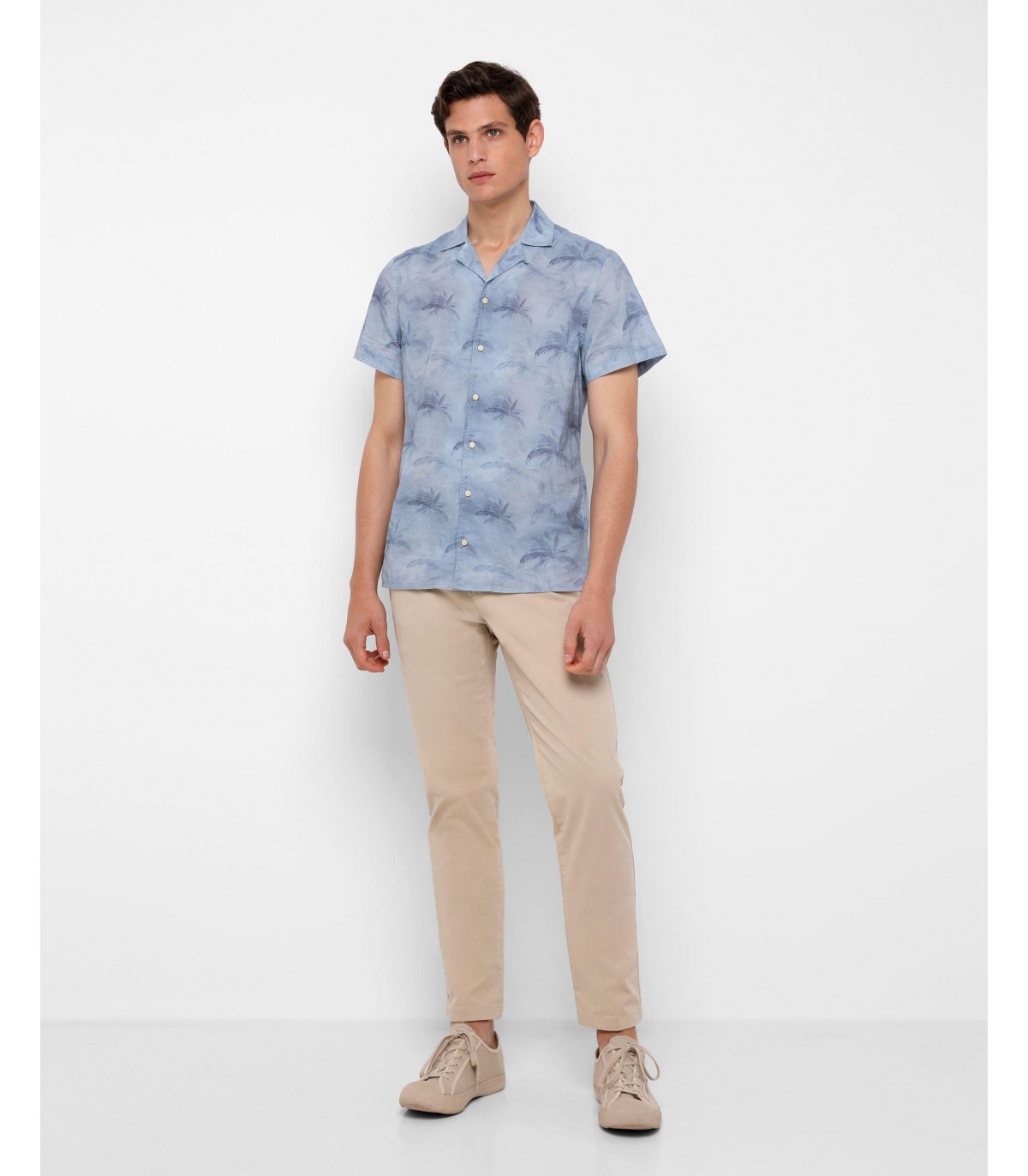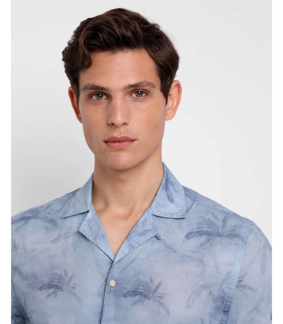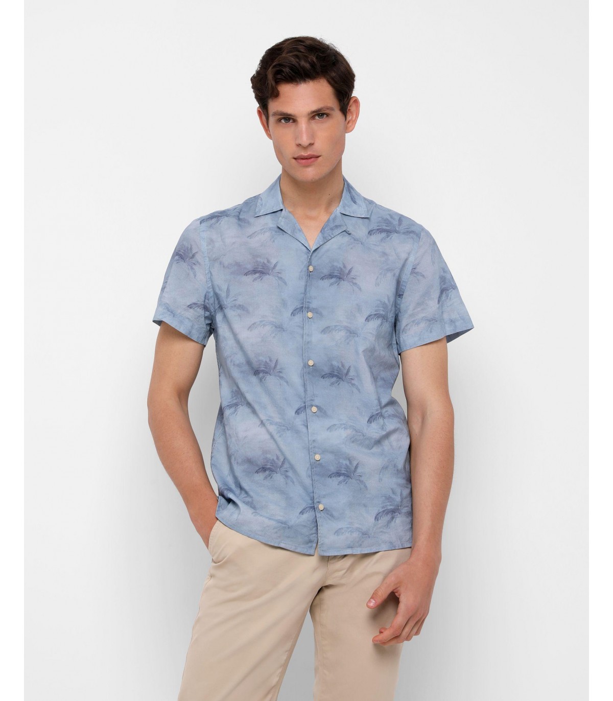 Camisa confeccionada en tejido 100% algodón. Corte Regular Fit, cuello cutaway y cierre con botones. Manga corta y dibujo palmeras.