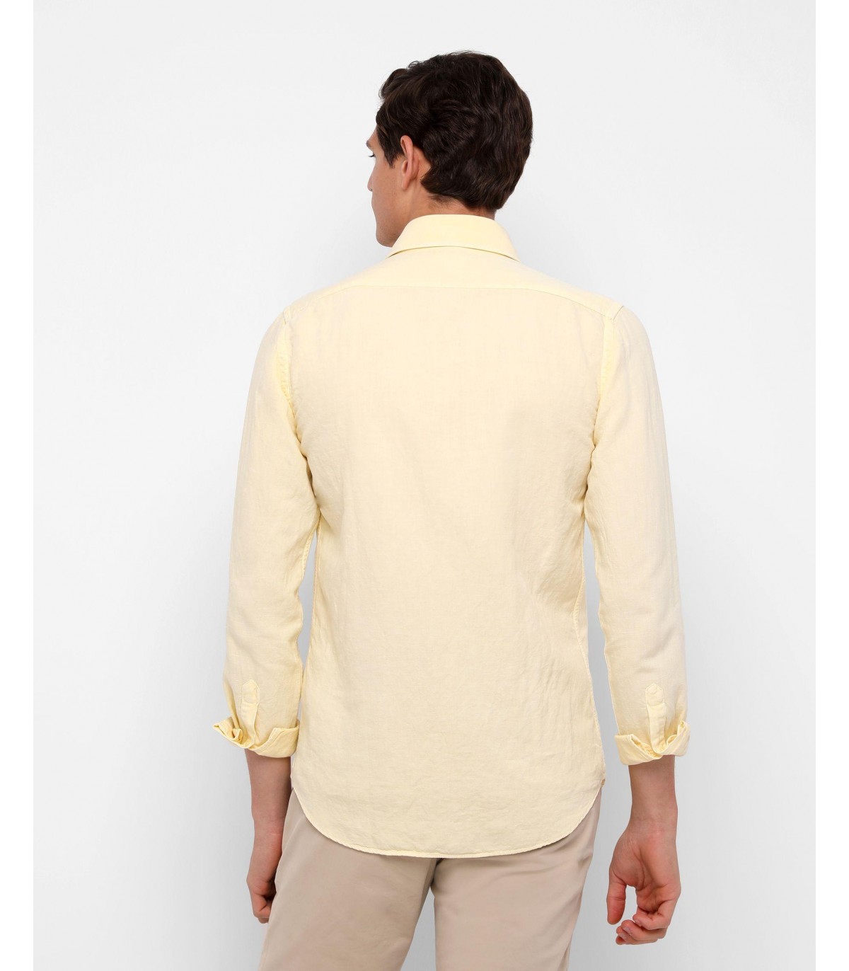 Camisa confeccionada en tejido 100% lino lavado. Corte Regular Fit, cuello cutaway y cierre con botones. Manga larga terminada en puño con botones y detalle de calavera a tono.