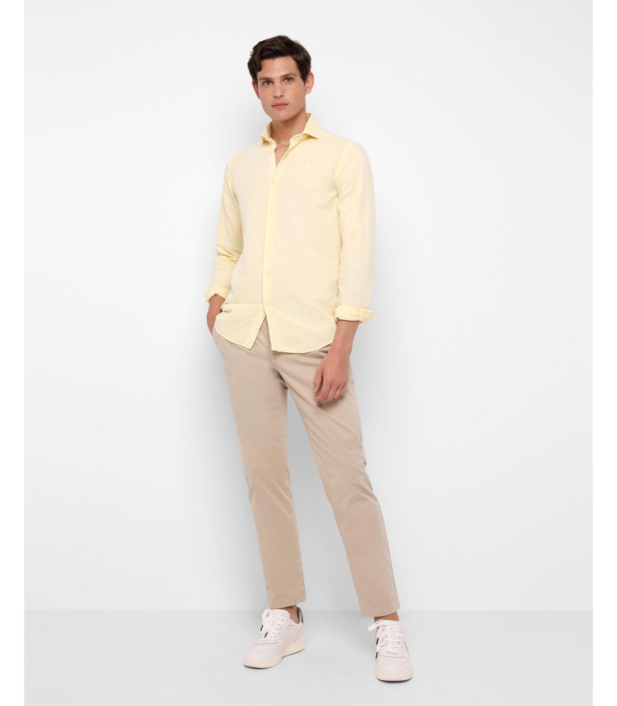 - Camisa confeccionada en tejido 100% lino lavado. Corte Regular Fit, cuello cutaway y cierre con botones. Manga larga terminada en puño con botones y detalle de calavera a tono.