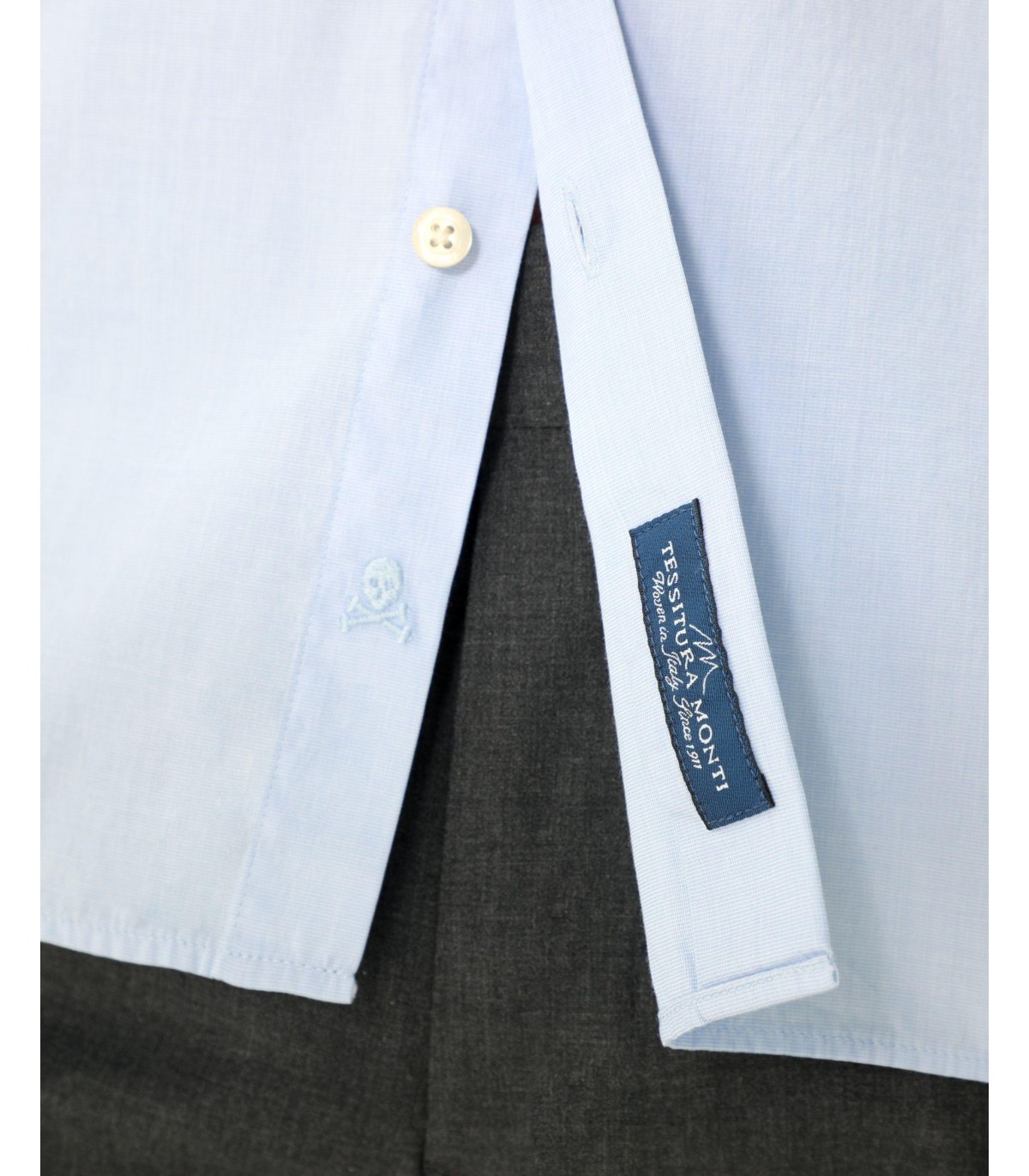 Camisa confeccionada en tejido 100% algodón. Corte Regular Fit, cuello con botones y cierre con botones. Manga larga terminada en puño con botones y detalle de calavera a tono.