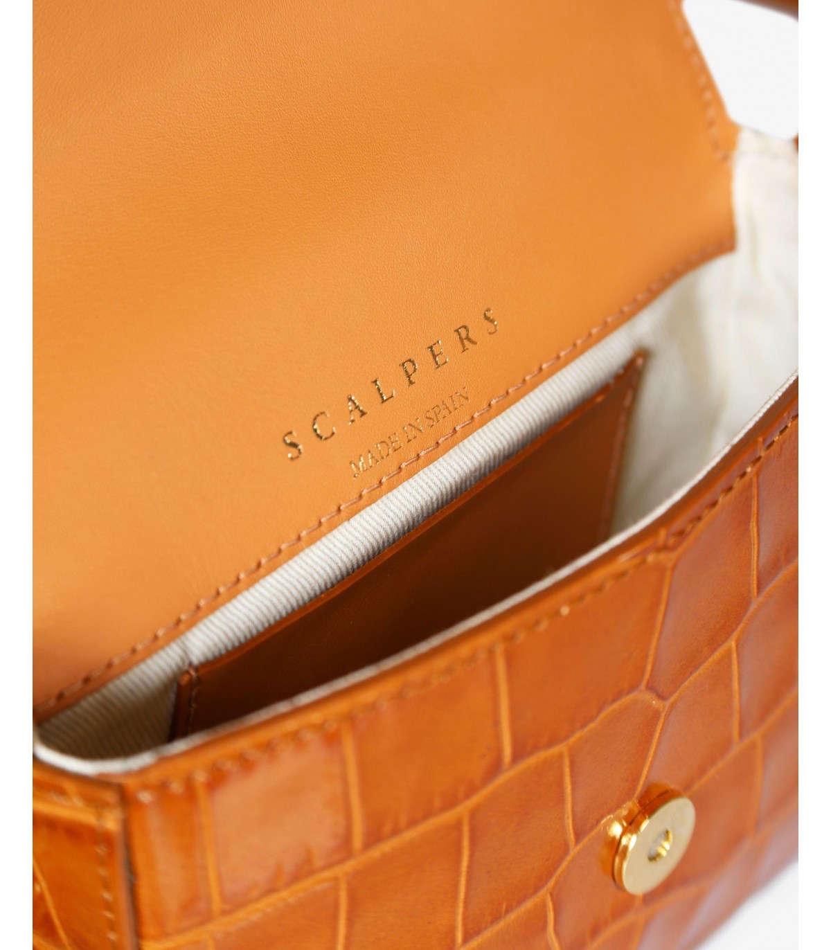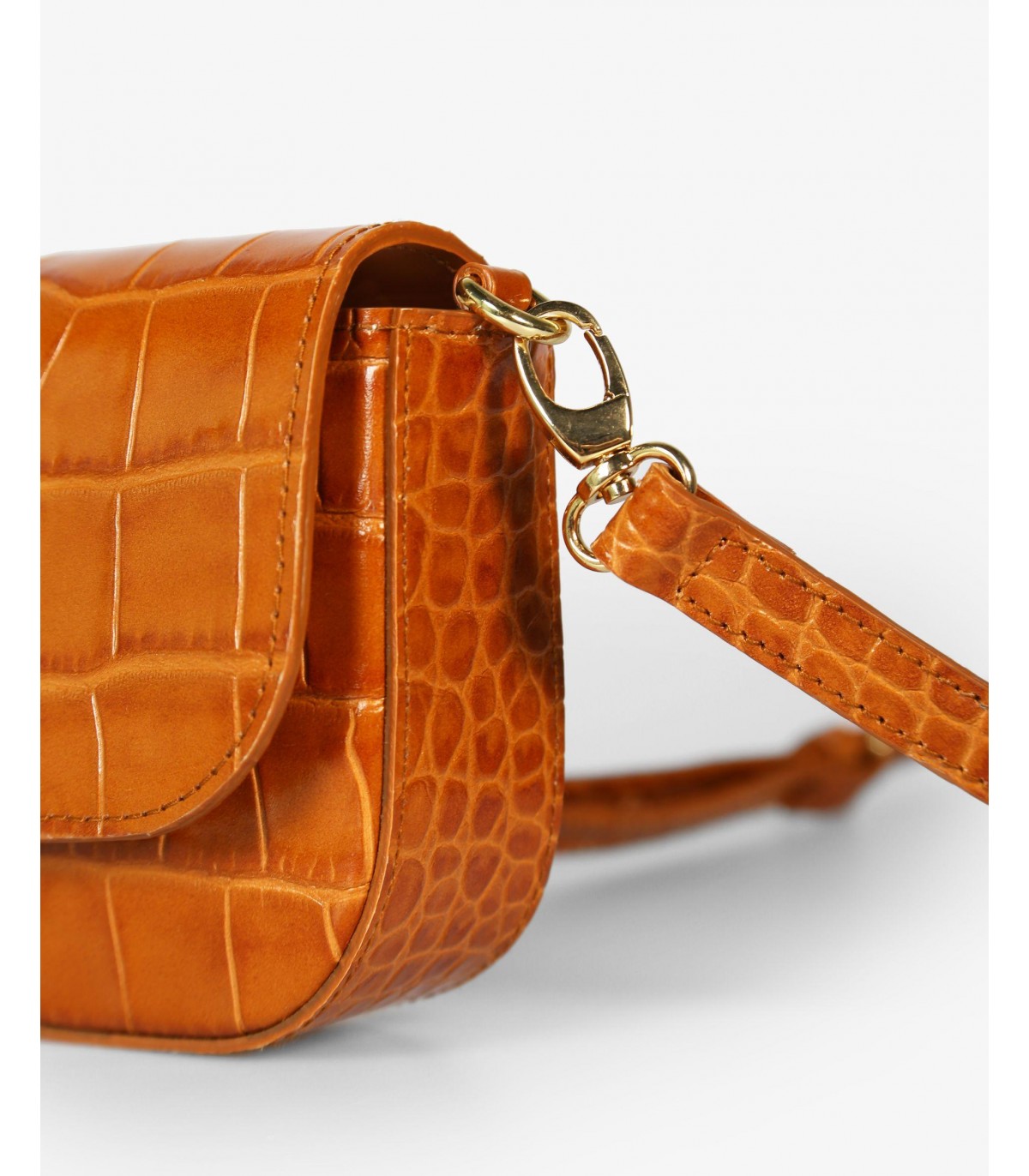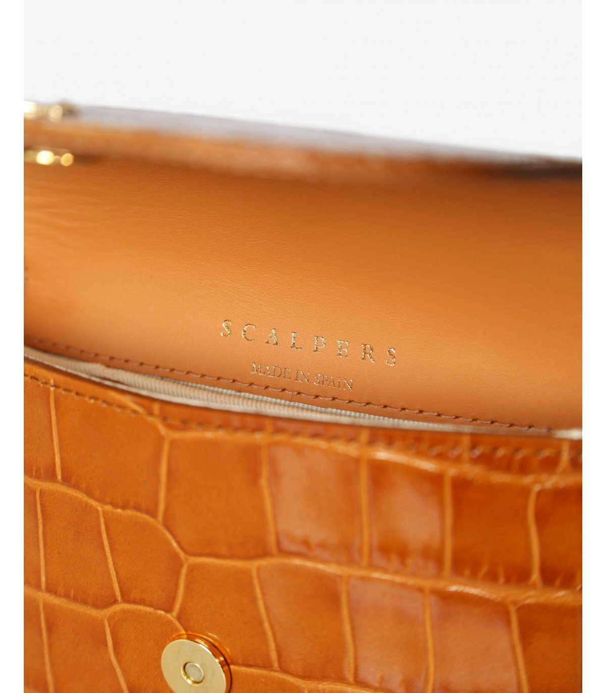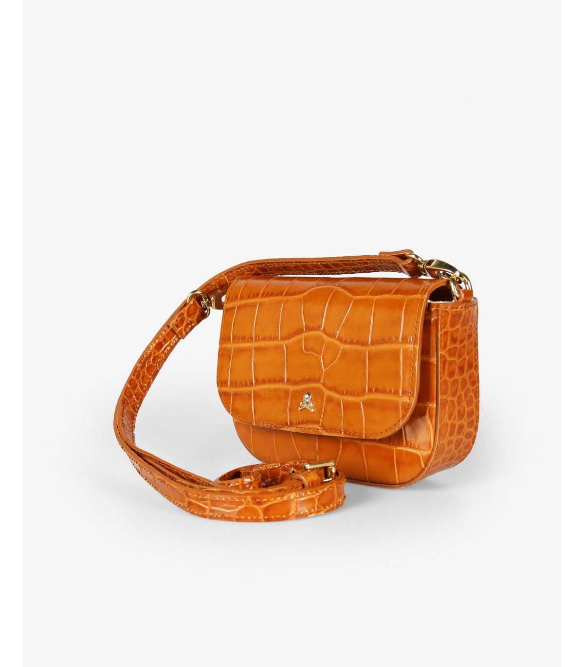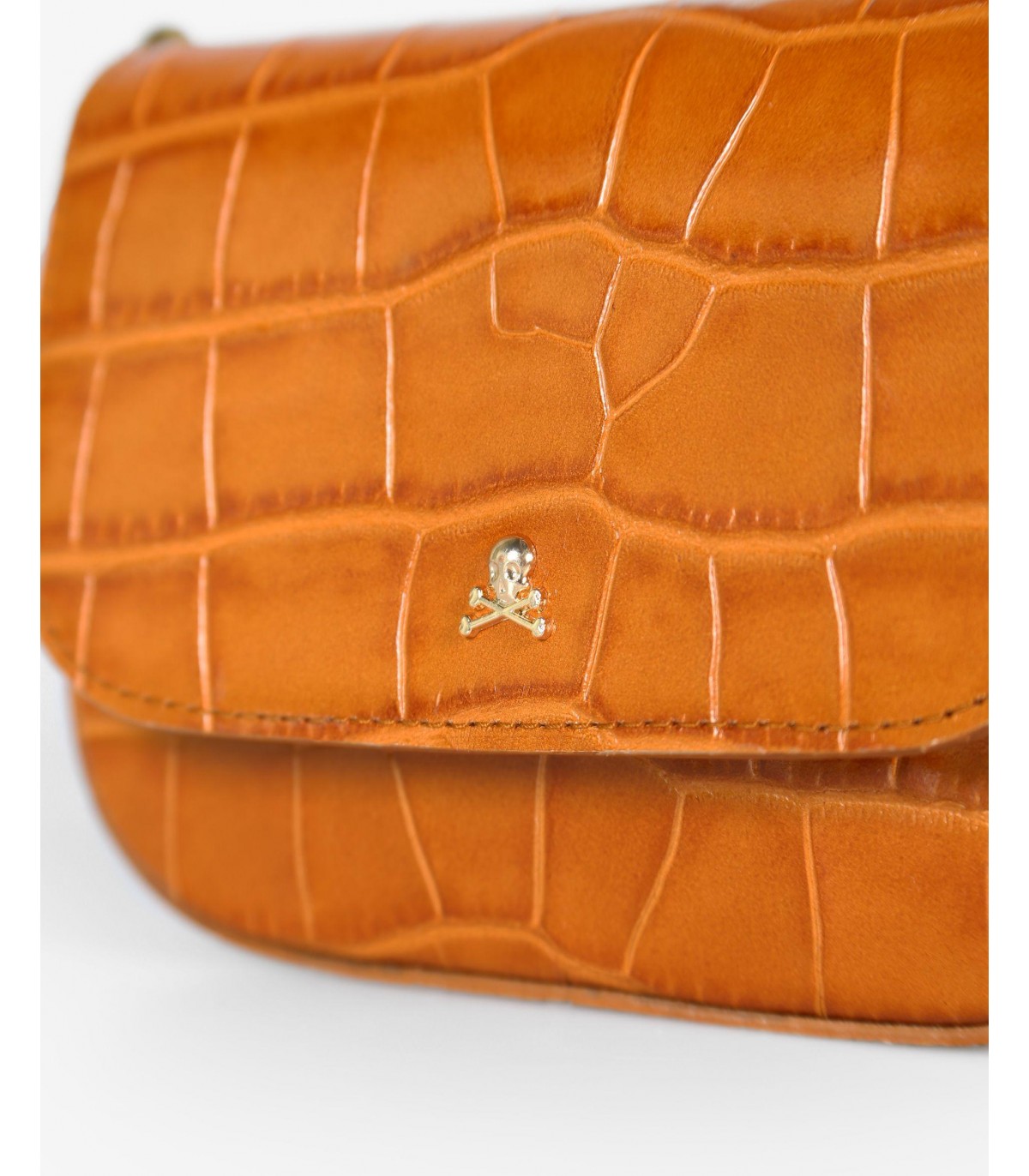 Bolso bandolera confeccionado en piel estilo cocodrilo. Asa larga ajustable y cierre con imán. Detalle de calavera.