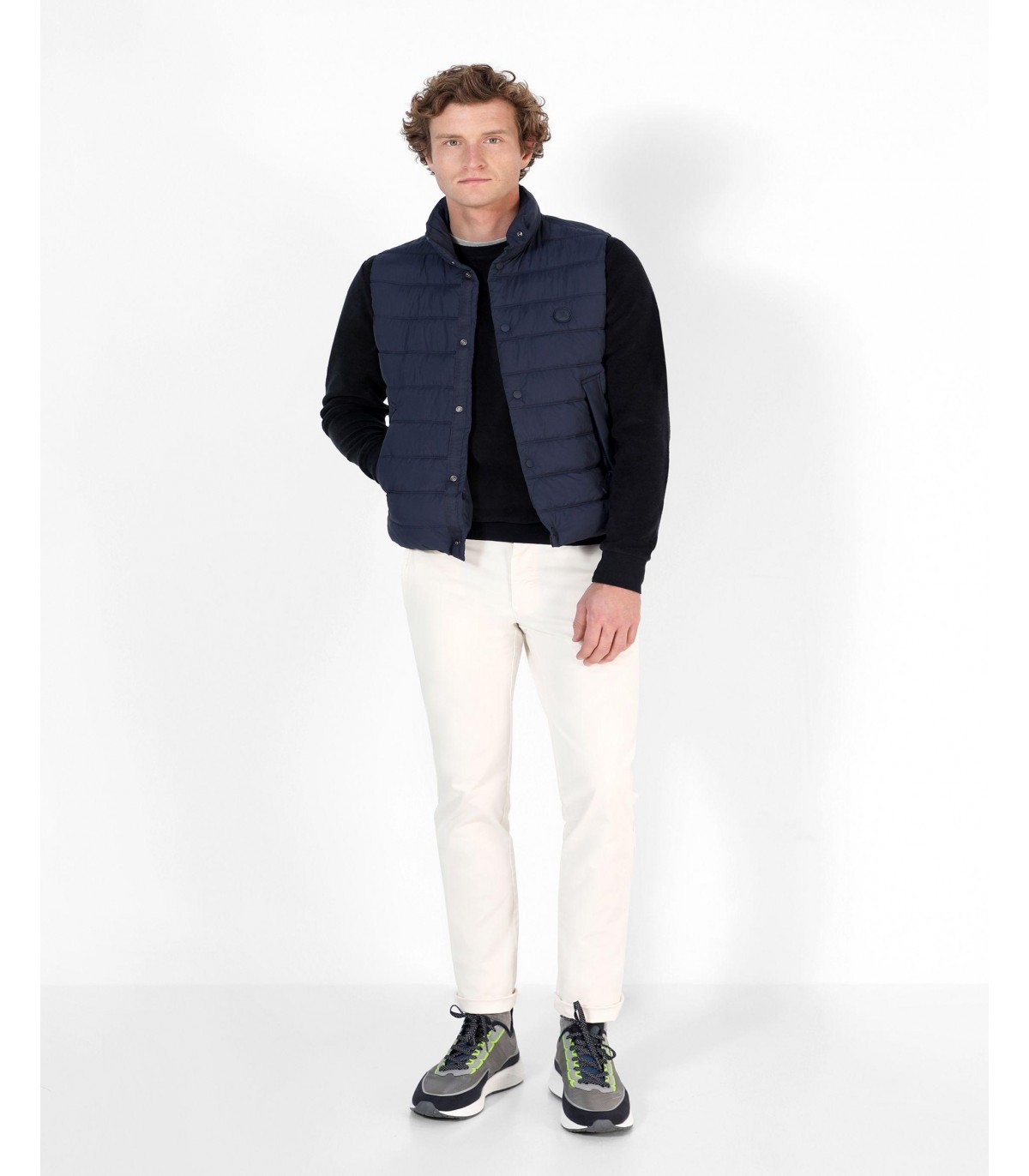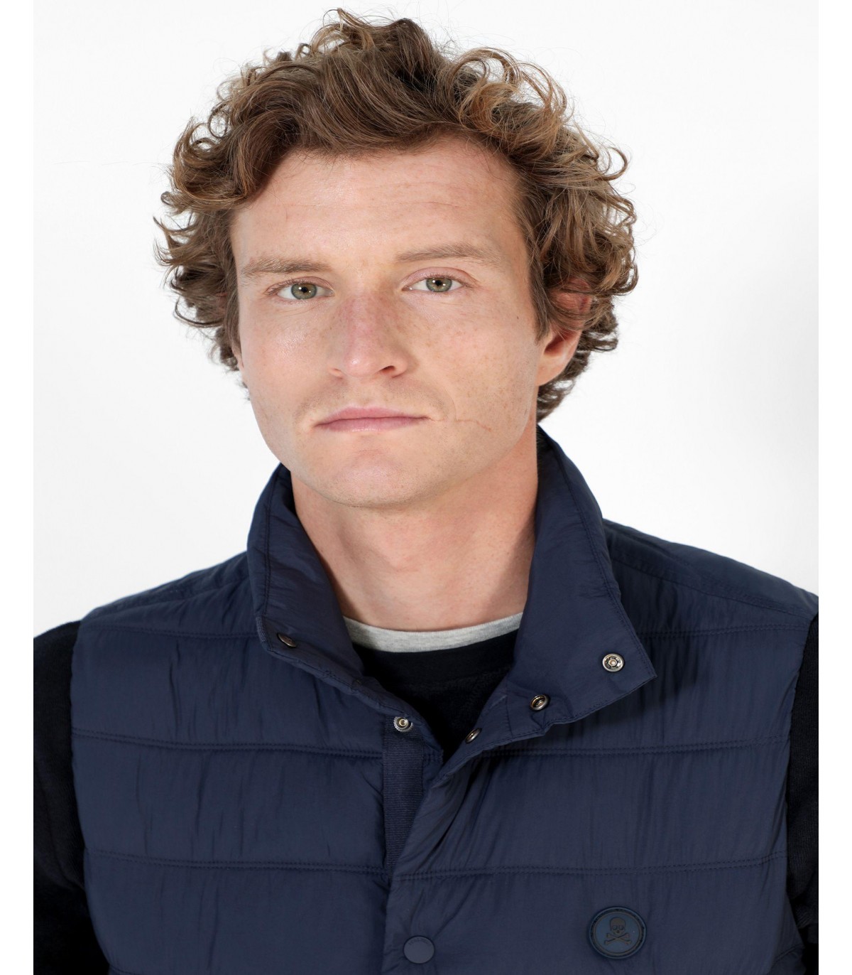Chaleco acolchado confeccionado en tejido de nailon y poliéster reciclado con acabado soft. Corte Regular Fit, cuello subido y cierre con snaps. Detalle de calavera engomada en el pecho y bolsillos insertados con tapeta invertida.
