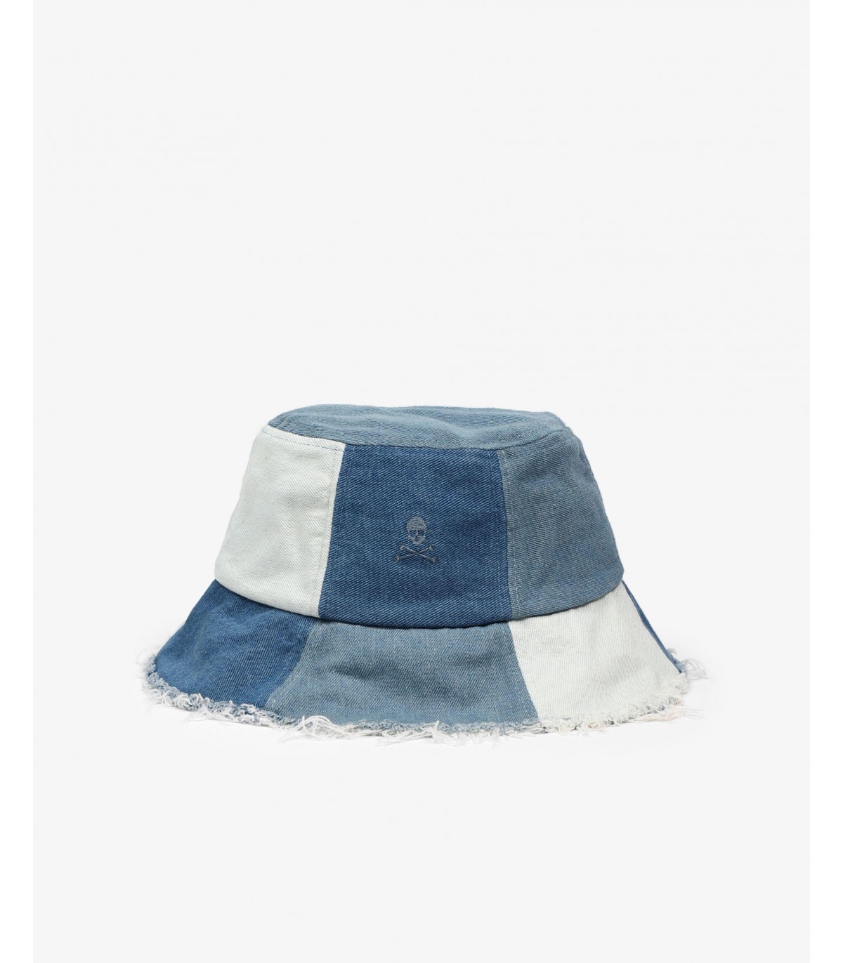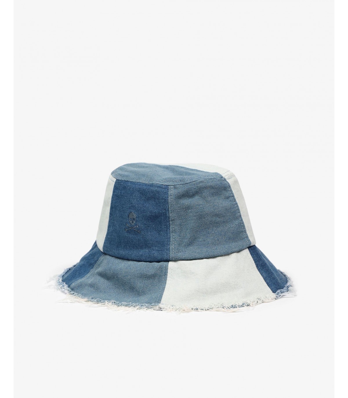 Gorro bucket con patchwork de tejidos denim. Detalle de calavera a tono.